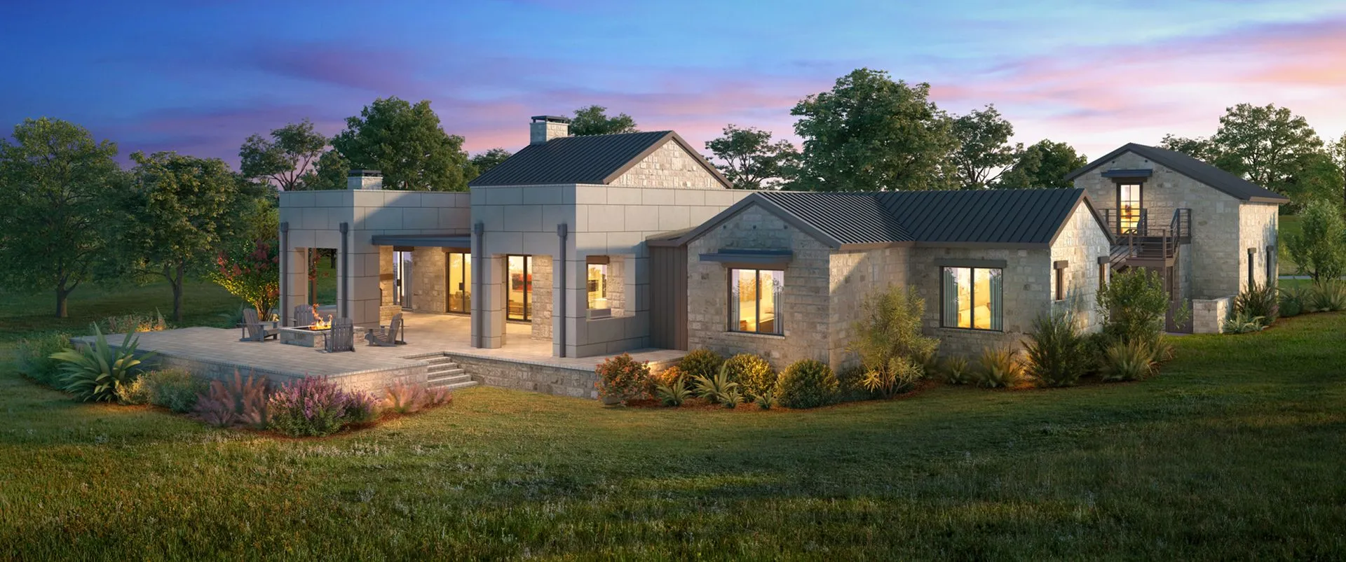 ARCHITECTURE: Architect Gene Hodgson, a member of the Boot Ranch Architectural Review Board, has created a highly flexible one-story base plan with 4 bedrooms and 4.5 baths, including a detached guest suite above the 2.5-car garage. Three distinctive exterior concepts — Hill Country traditional (Milam), transitional (Edwards), and contemporary (Austin) — offer additional customization. Options include an entry tower, a front courtyard, and an attached casita to create a fifth bedroom. A block of design time with the architect is included to adapt the plan to the buyer’s homesite and personalize it to meet the buyer’s criteria.